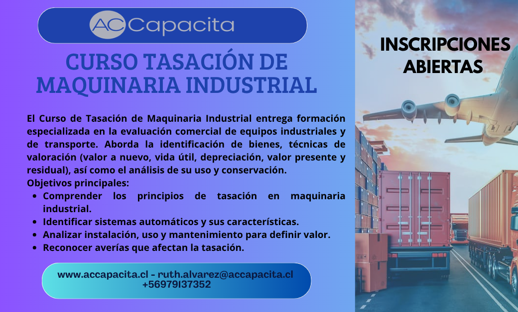 El Curso Tasación de Maquinaria Industrial ofrece una formación especializada en la materia de la evaluación comercial de equipos industriales, rodados y equipos de transporte comúnmente utilizados en los distintos rubros de la producción; por lo anterior, se abordan tanto materias de identificación de bienes como también aquellas técnicas de definición de valor a nuevo, reconocimiento de vida útil, depreciación, valor presente y valor residual.